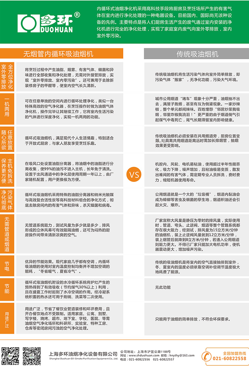 無煙管內循環吸油煙機是采用高科技手段將廚房及烹飪場所產生的油煙及有害氣體在室內進行凈化處理的一種電器設備。目前國內、國際尚無該種設備的先例。上海多環油煙凈化設備有限公司科研團隊從解決社會大氣污染及凈化家庭室內空氣出發經過多年的研究和實驗開發生產出了一種適合國人烹飪需要的內循環式油煙凈化機,它的主要特點是采用吸排凈化一體機的形式將烹飪產生的油脂、煙顆粒物及有害氣體(醛、苯、VOC等)、異味(辣、臭、酸味等)和有害細菌在室內進行凈化處理,實現了廚房油煙向室外不排放,室內室外無污染,解決了廚房油煙氣體排放污染環境的世界性難題。本公司研發生產的無管式油煙凈化機是不用煙管對外排放的油煙凈化設備,采用吸排凈化一體機的形式將烹飪產生的油脂、煙顆粒物及有害氣體(醛、苯、VOC等)、異味(辣、臭、酸味等)和有害細菌在室內進行凈化處理的廚電產品。